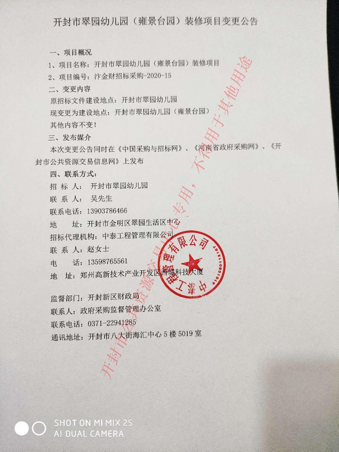 开封市翠园幼儿园(雍景台园)装修项目变更公告