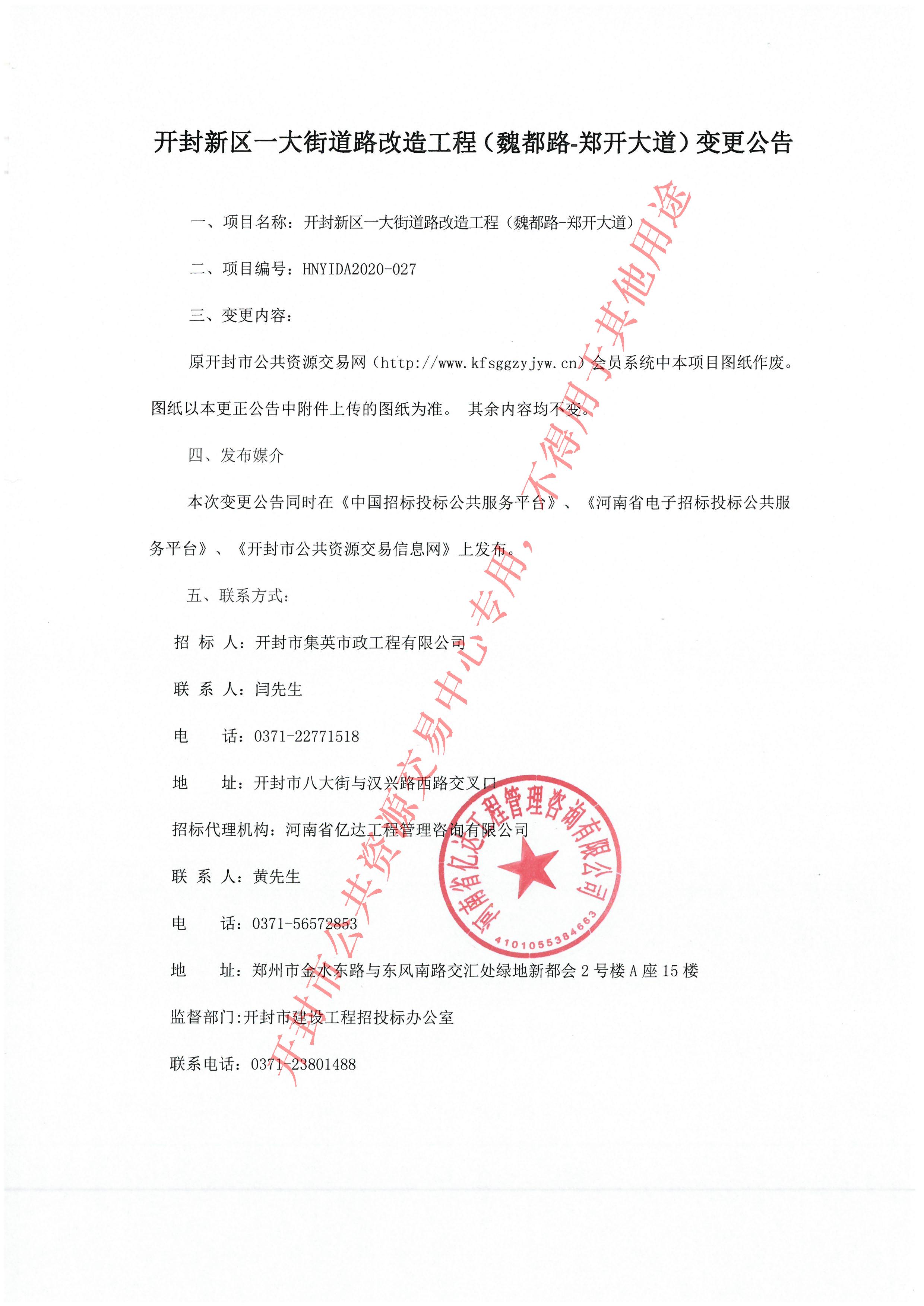开封新区一大街道路改造工程(魏都路-郑开大道)变更公告