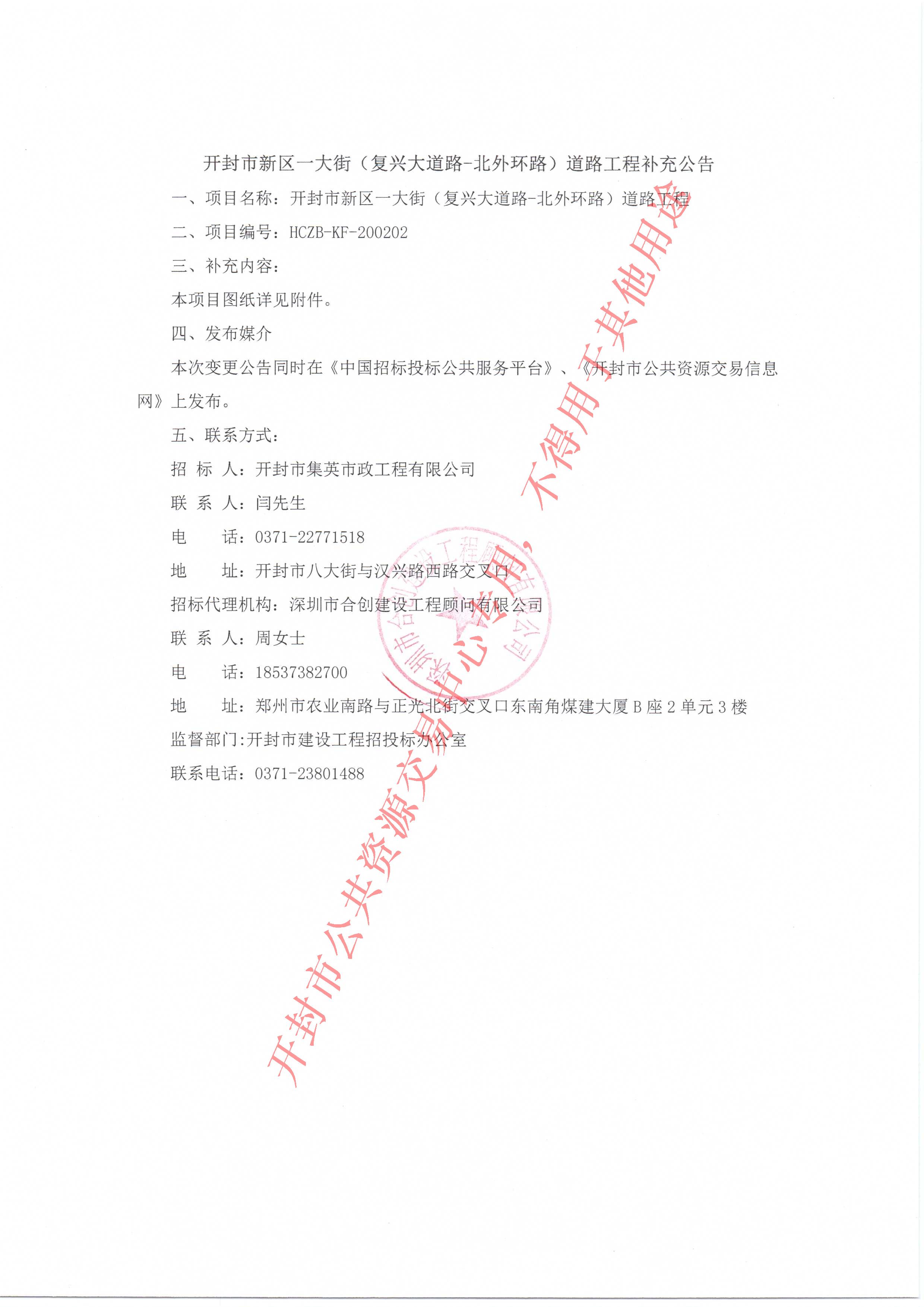 开封市新区一大街(复兴大道路-北外环路)道路工程补充公告