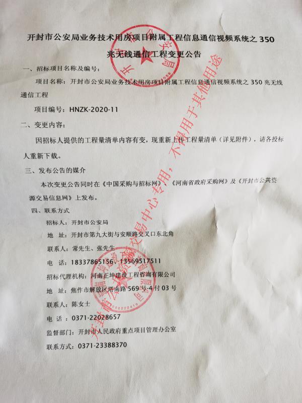 开封市公安局业务技术用房项目附属工程信息通信视频系统之350兆无线通信工程变更公告
