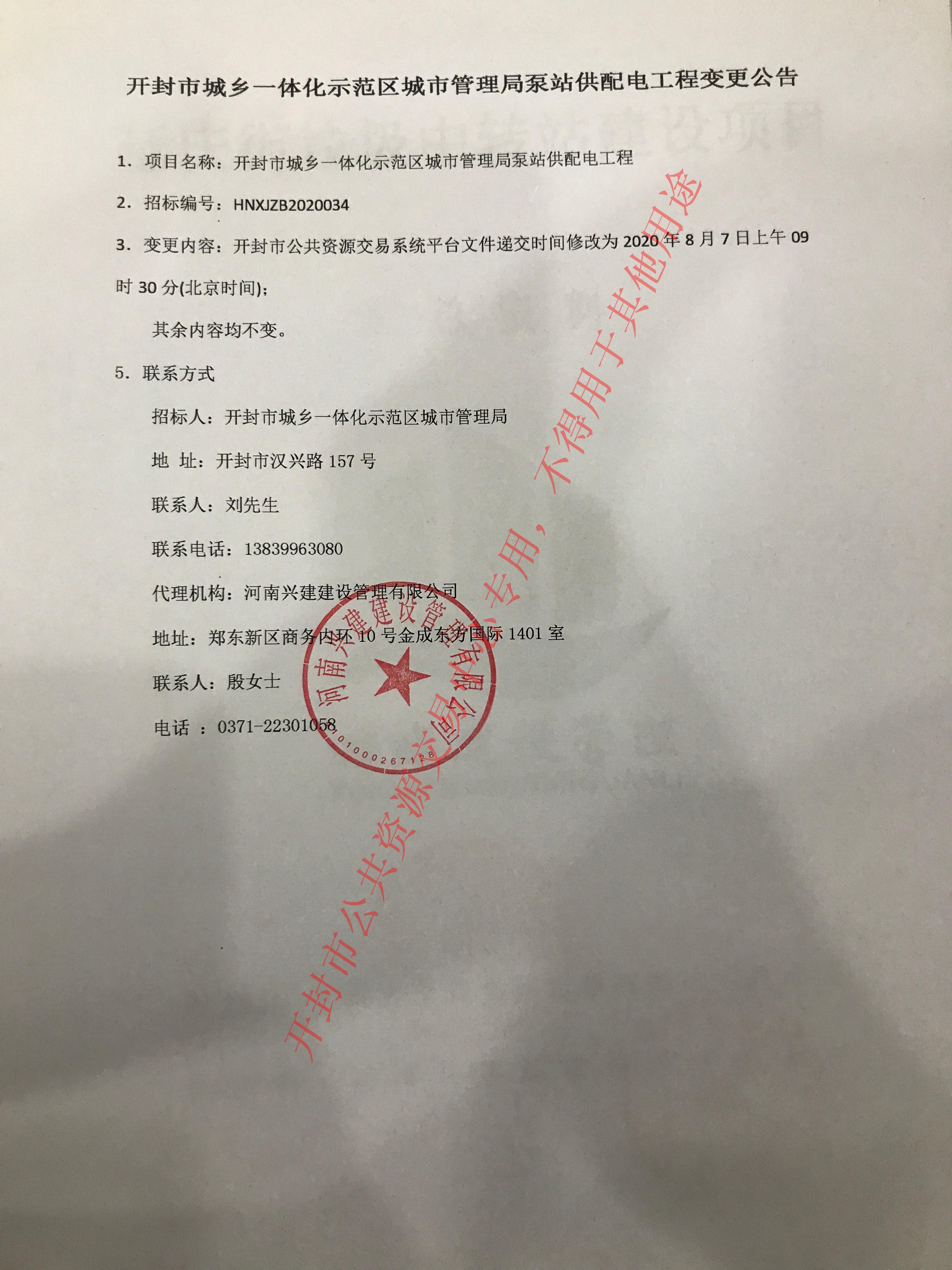 开封市城乡一体化示范区城市管理局泵站供配电工程变更公告