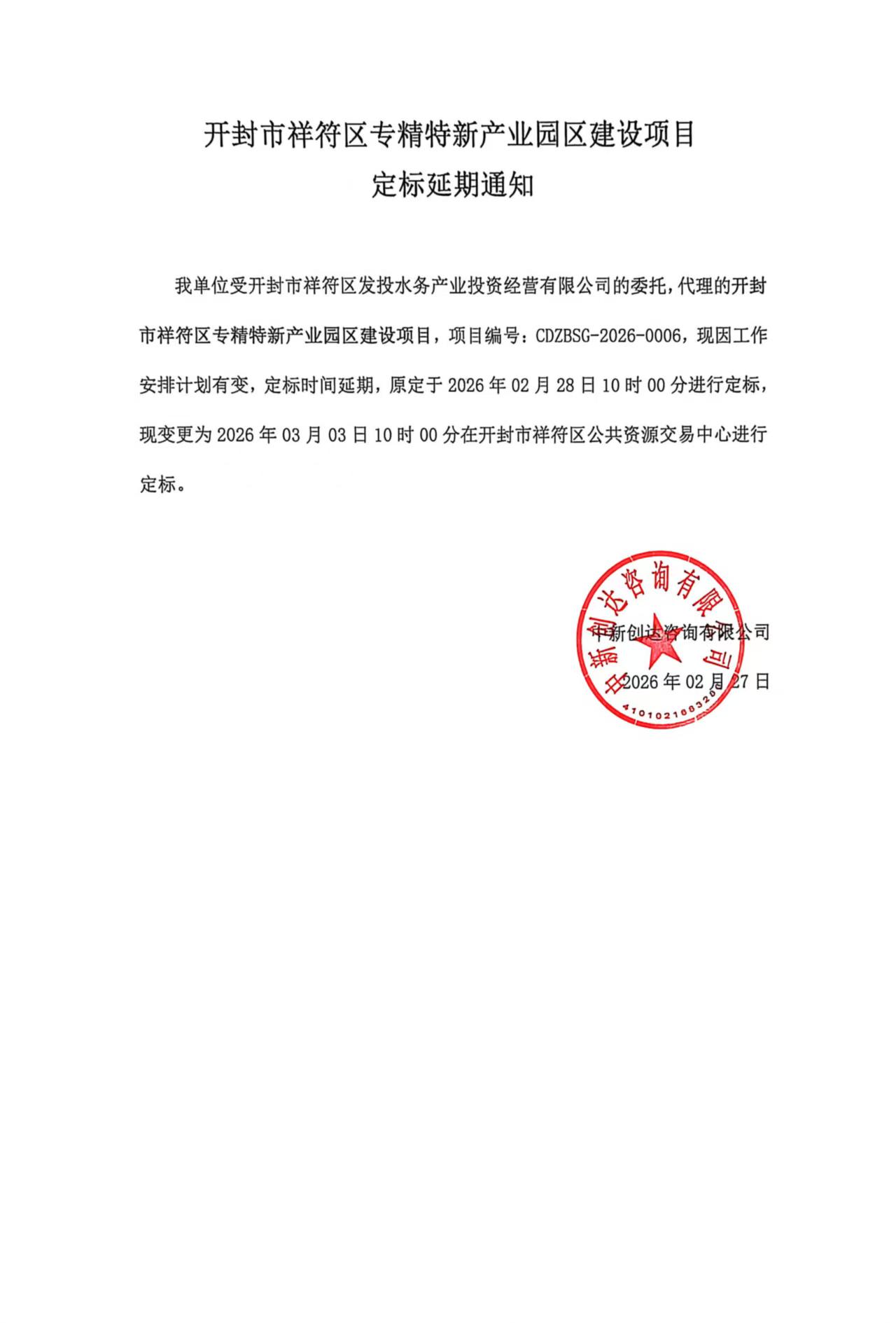 我单位受开封市祥符区发投水务产业投资经营有限公司的委托,代理的开封市祥符区专精特新产业园区建设项目,项目编号:CDZBSG-2026-0006,现因工作安排计划有变,定标时间延期,原定于2026年02月28日10时00分进行定标,现变更为2026年03月03日10时00分在开封市祥符区公共资源交易中心进行定标。