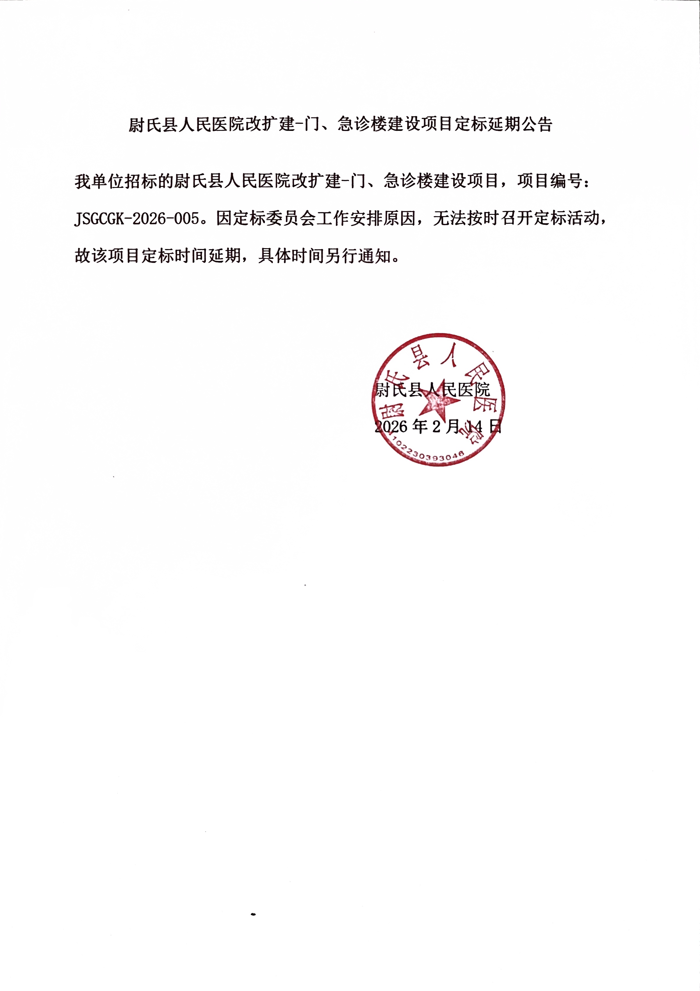 我单位招标的尉氏县人民医院改扩建-门、急诊楼建设项目,项目编号:JSGCGK-2026-005。因定标委员会工作安排原因,无法按时召开定标活动,故该项目定标时间延期,具体时间另行通知。
