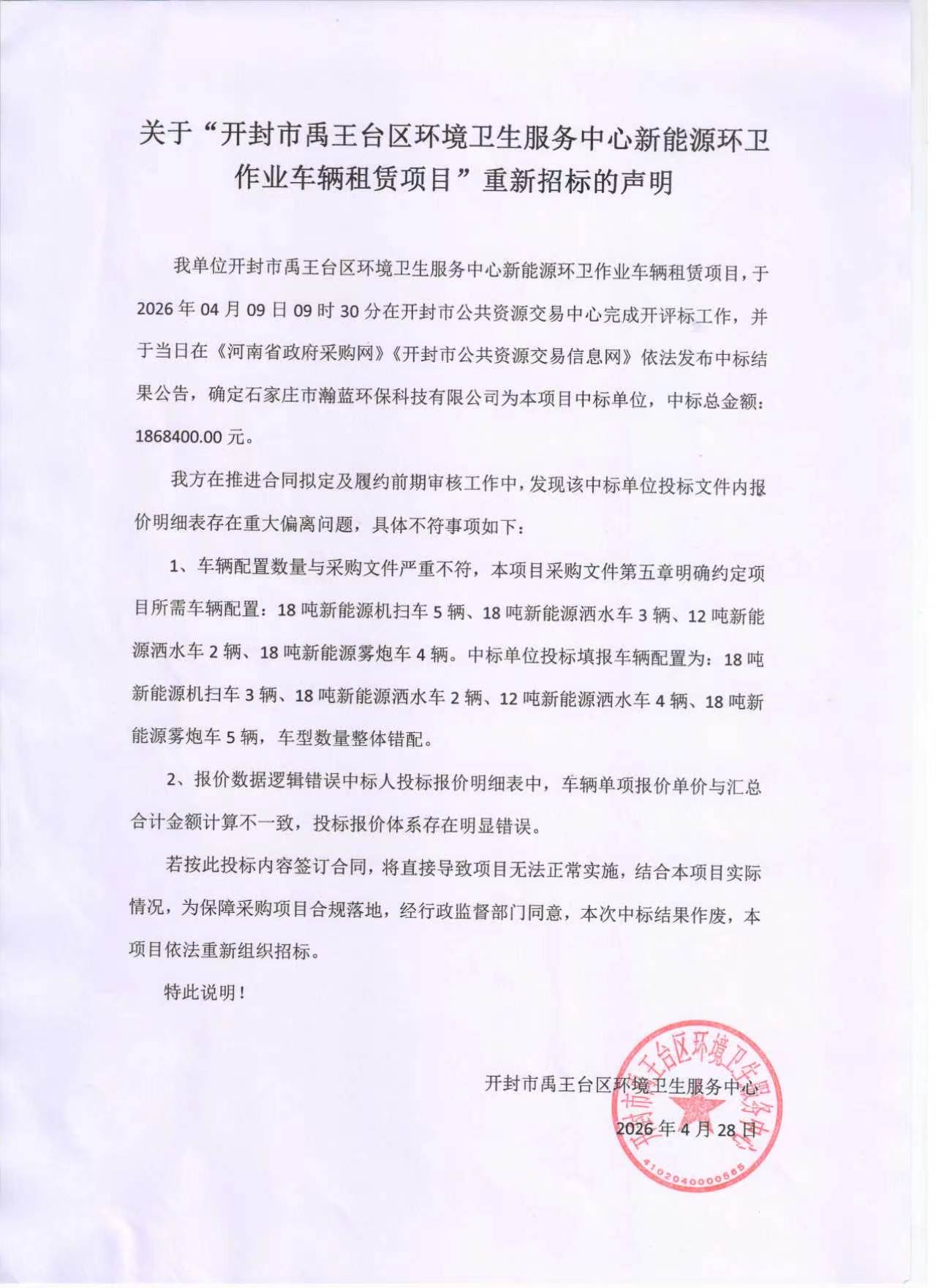 我单位开封市禹王台区环境卫生服务中心新能源环卫作业车辆租赁项目,于2026年04月09日09时30分在开封市公共资源交易中心完成开评标工作,并于当日在《河南省政府采购网》《开封市公共资源交易信息网》依法发布中标结果公告,确定石家庄市瀚蓝环保科技有限公司为本项目中标单位,中标总金额:1868400.00元。