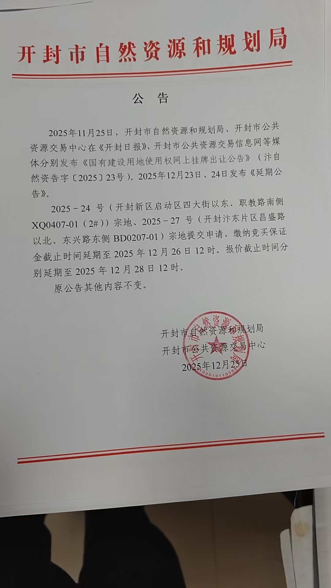 2025-24号(开封新区启动区四大街以东、职教路南侧XQ0407-01(2#))宗地、2025-27号(开封汴东片区昌盛路以北、东兴路东侧BD0207-01)宗地提交申请、缴纳竞买保证金截止时间延期至2025年12月26日12时。报价截止时间分别延期至2025年12月28日12时。