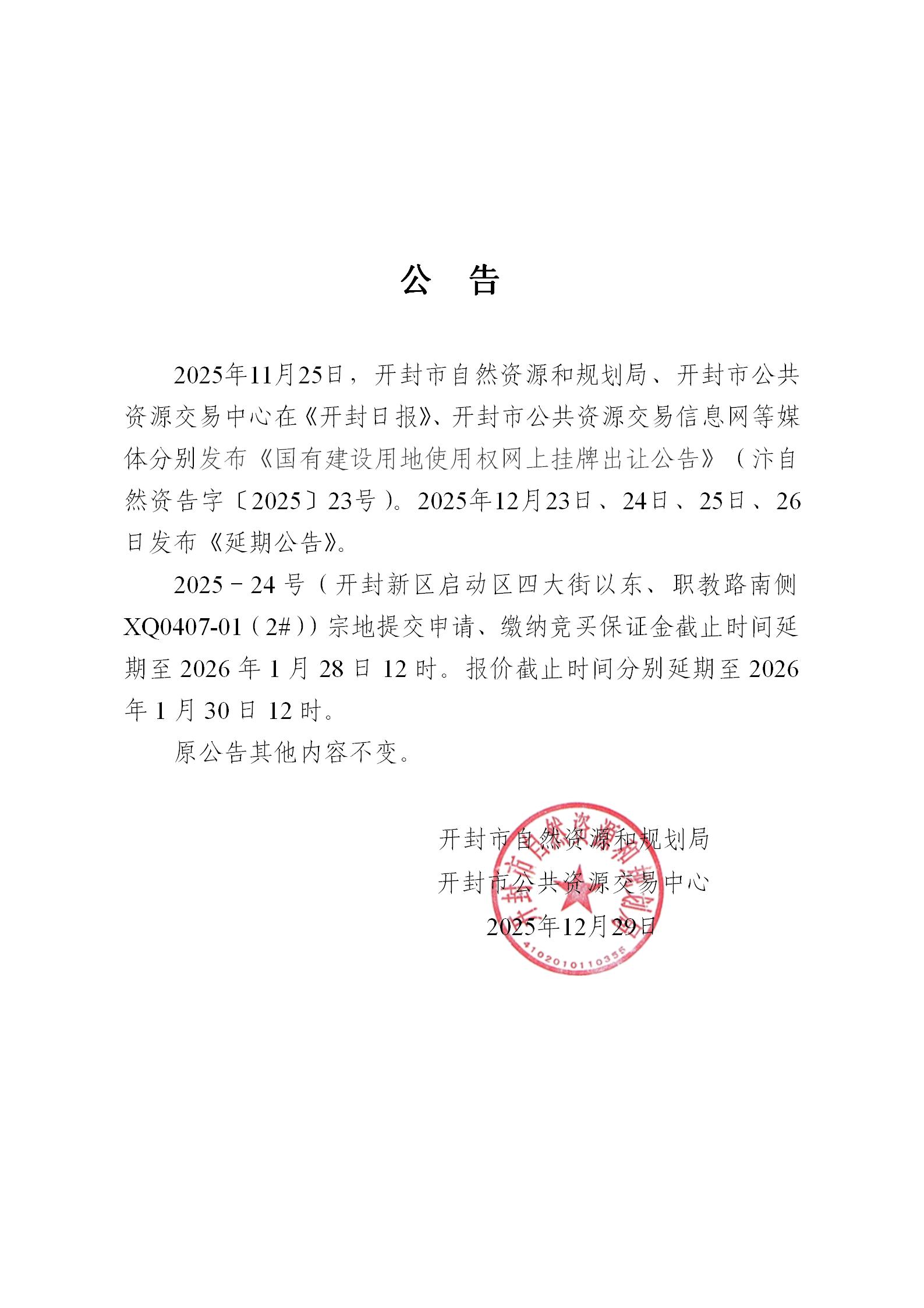 2025-24号(开封新区启动区四大街以东、职教路南侧XQ0407-01(2#))宗地提交申请、缴纳竞买保证金截止时间延期至2026年1月28日12时。报价截止时间分别延期至2026年1月30日12时。