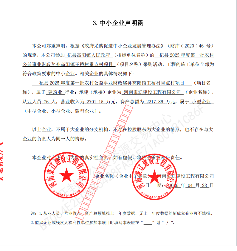 杞县2025年度第一批农村公益事业财政奖补高阳镇王桥村重点村项目成交公告